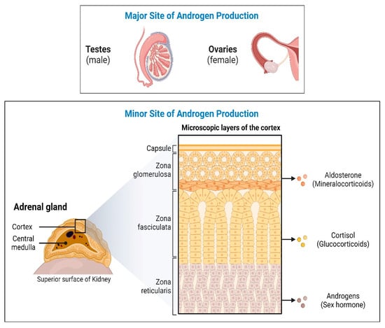 In humans, androgens are primarily produced in the male testis, female ovaries, and adrenal glands (Figure 2). Androgens control male sexual traits and development, as well as influence female sexual behavior. The zona reticularis of the adrenal cortex produces dehydroepiandrosterone (DHEA) and its sulfate DHEA(S). DHEA acts as a precursor to produce androgens (testosterone and androstenedione). The first, and rate-limiting, step in the biosynthesis of all steroid hormones is the cleavage of the cholesterol side chain by the mitochondrial P450 enzyme CYP11A1 to convert cholesterol into pregnenolone (Preg/P5) []. Further, in multi-enzymatic steps, Preg is converted into mineralocorticoids, glucocorticoids, and androgens.