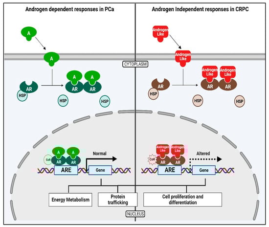 PCa cells are driven by the binding androgens to the androgen receptor (AR). The AR then acts as a transcriptional activator for the expression of genes that are responsible for the growth and progression of the PCa cells. In addition, chemicals resembling androgen-like structures may also bind to and activate androgen receptors and create signaling events similar to the effects of androgens. Created by https://www.Biorender.com.