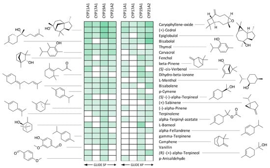 Heat maps of binding poses obtained after docking of terpenes from essential oils into steroid-metabolizing CYP enzymes. Here, we show 25 of the best binding poses. A full list is available in the supplementary materials. Binding energies vary from −8.2 kcal/mol for the best binding poses (corresponding to dark green boxes) to −3.3 kcal/mol for the poorest binding poses (white boxes).