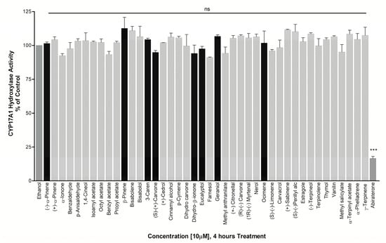 Assay of CYP17A1 17α-hydroxylase activity. Essential oil compounds were tested for effects on CYP17A1 17α-hydroxylase activity using radiolabeled progesterone as substrate and conversion to 17-hydroxy progesterone was monitored using autoradiography of steroids after separation by TLC. The CYP17A1 inhibitor abiraterone was used as a positive control. Effects were calculated as percentage of control. Compounds showing differential activities in different assays are shown as darker bars. ns: not significant, *** p < 0.001