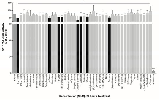 Effect of essential oil compounds of CYP17A1 17,20 lyase activity. Compounds were tested for effects on CYP17A1 17,20 lyase activity using radiolabeled 17OH-Pregnenolone as substrate and conversion to DHEA was monitored using scintillation counting. The CYP17A1 inhibitor abiraterone was used as a positive control. Effects were calculated as percentage of control. Compounds showing differential activities in different assays are shown as darker bars. *** p < 0.001