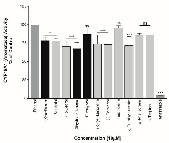 Effects of essential oil components on CYP19A1 activity. Essential oil components were tested against CYP19A1 activity using microsomes prepared from placental JEG-3 cells. Radiolabeled androstenedione was used as substrate and conversion to estrone was monitored by water-release assay. A known CYP19A1 inhibitor, anastrazole, was used as positive control. Compounds showing differential activities in different assays are shown as darker bars. ns, not significant, * p < 0.05, *** p < 0.001