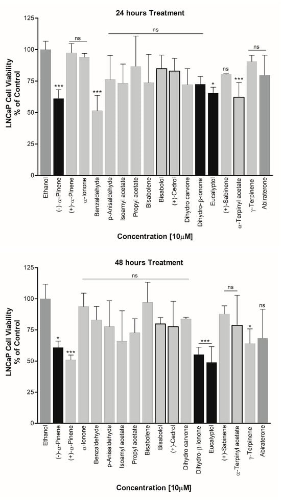 Effect of essential oil components on LNCaP cell proliferation. Essential oil compounds were checked for the effect on proliferation of androgen-dependent PCa cell line on LNCaP cells. Cell viability was determined after 24 h and 48 h treatment with selected compounds that showed inhibitory effects in cytochrome P450 assays. The CYP17A1 inhibitor abiraterone, an anti-prostate cancer drug in clinical use, was used as a positive control. Compounds showing differential activities in different assays are shown as darker bars. ns, not significant, * p < 0.05, *** p < 0.001