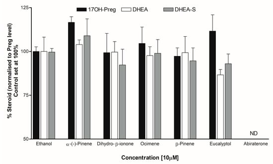 Studies in human cell lines [,] have shown that lavender oil (LO) and tea tree oil (TTO) act as hormone mimickers for estrogen receptors (ERs) and antagonists for ARs. Moreover, LO and TTO impacted the ER- and AR-mediated regulation of several endogenous genes. Owing to these different mechanisms of action by LO and TTO, we screened several EO components, including the ones found in TTO and LO. In the initial screening of 50 test compounds against CYP17A1 hydroxylase activity, we found no significant effect in NCI H295R cells treated with 10 µM of compounds for 4 h (Figure 7).