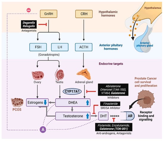Androgen production and its role in PCOS and PCa and different approaches to target androgen production. Several different approaches are being currently being pursued to target androgen production for the treatment of hyperandrogenic disorders. These include GnRH antagonists, CYP17A1 inhibitors, 5α-reductase inhibitors, and androgen receptor-targeting chemicals. Created by https://www.Biorender.com.