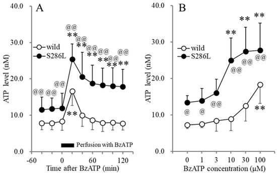 The basal levels of extracellular ATP in the OFC of S286L-TG at the age of the onset of interictal discharges and before the onset of ADSHE onset (7-week-old) (11.6 ± 3.4 nM) were higher than those of wild type (7.9 ± 1.9 nM) (Figure 1). Perfusion with BzATP (1–100 μM) into the OFC increased extracellular ATP levels in the OFC (BzATP-evoked release) of both wild type and S286L-TG, in a concentration-dependent manner; however, the BzATP-evoked ATP release of S286L-TG was larger in comparison to that in the wild type (Figure 1). Perfusion with >10 μM BzATP increased ATP release in S286L-TG, while 100 μM BzATP was required to increase the ATP release in the wild type (Figure 1). After the discontinuation of 100 μM BzATP, the extracellular ATP levels of wild type immediately returned to baseline levels, while those of S286L-TG persisted, increasing the ATP release.