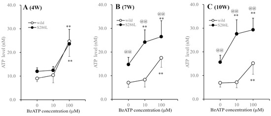 Age-dependent fluctuations in BzATP-evoked ATP releases in the OFC of wild type and S286L-TG. Panels (A–C) indicate the BzATP-evoked ATP releases of wild type (opened circles) and S286L-TG (closed circles) at 4, 7 and 10 weeks of age, respectively. Ordinates and abscissas indicate the mean ± SD (n = 6) of the extracellular ATP levels in the OFC (nM) and BzATP levels (μM), respectively. ** p < 0.01 relative to BzATP free (0), @@ p < 0.01 relative to the wild type using two-way ANOVA with Scheffe’s post hoc test. F values for 4, 7 and 10 weeks of age were [Fgenotype(1,30) = 1.0 (p > 0.1), FBzATP(2,30) = 44.4 (p < 0.01), Fgenotype×BzATP(2,30) = 0.8 (p > 0.1)], [Fgenotype(1,30) = 71.4 (p < 0.01), FBzATP(2,30) = 22.8 (p < 0.01), Fgenotype×BzATP(2,30) = 3.4 (p < 0.05)] and [Fgenotype(1,30) = 40.4 (p < 0.01), FBzATP(2,30) = 6.3 (p < 0.01), Fgenotype×BzATP(2,30) = 3.7 (p < 0.05)], respectively.