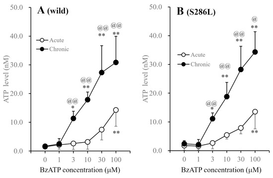 Concentration-dependent effects of BzATP on astroglial ATP release from cultured astrocytes of wild type and S286L-TG. After the incubation in fDMEM without (acute: opened circles) and with (chronic: closed circles) 1 μM BzATP for 14 d (DIV14-28), cultured astrocytes were incubated in ACSF containing BzATP (ranging from 0 to 100 μM). Panel (A,B) indicate the concentration-dependent effects of BzATP on ATP release from cultured astrocytes of wild type and S286L-TG, respectively. The ordinate and abscissa indicate the mean ± SD (n = 6) of extracellular ATP levels during BzATP-evoked stimulation and BzATP concentration (μM), respectively. * p < 0.05, ** p < 0.01 relative to BzATP free (0), @ p < 0.05, @@ p < 0.01 relative to acute using two-way ANOVA with Scheffe’s post hoc test. F values in concentration dependence in the wild type and S286L-TG were [Fexposure(1,60) = 88.4 (p < 0.01), FBzATP(5,60) = 40.9 (p < 0.01), Fexposure×BzATP(5,60) = 10.4 (p < 0.01)] and [Fexposure(1,60) = 124.0 (p < 0.01), FBzATP(5,60) = 57.9 (p < 0.01), Fexposure×BzATP(5,60) = 14.9 (p < 0.01)], respectively.