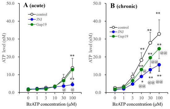 To clarify the acute concentration-dependent effects of BzATP, cultured astrocytes, which were incubated in fDMEM without 1 μM BzATP from DIV14 to DIV28, were incubated in ACSF containing BzATP (1–100 μM) with or without 1 μM JNJ47965567 or 20 μM Gap19. To clarify the effects of long-term exposure to BzATP (1 μM), the cultured astrocytes were incubated in fDMEM containing 1 μM BzATP (1 μM BzATP did not affect the astroglial ATP release) from DIV14 to DIV28. After the washout using ACSF, cultured astrocytes were incubated in ACSF containing BzATP (concentration: 1–100 μM) with or without 1 μM JNJ47965567 or 20 μM Gap19.