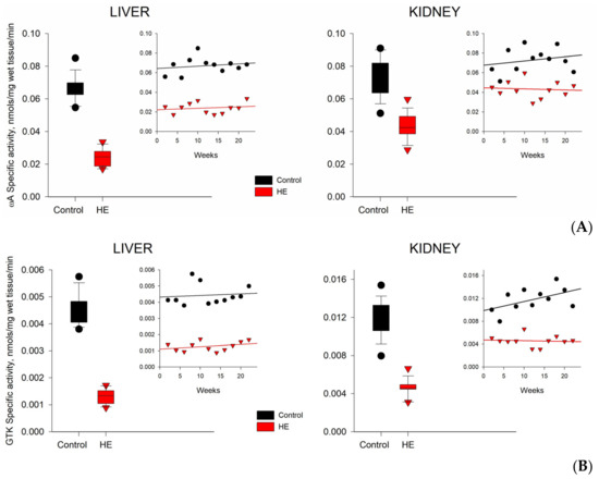 Figure 5). The specific activity of GTK turned out to be more vulnerable to the effects of the toxin than ωA, which may be due to its initially lower activity in tissues. Thus, in control samples of the brain tissue and blood plasma of rats, the activity of GTK was lower than the levels of ωA activity by ~2.5 and ~5 times, and in the kidney and liver tissues of rats by ~6 and ~15 times, respectively. With the development of HE, this discrepancy only increased.