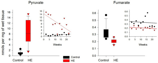 The analysis of the levels and distribution of Pyr and Lac in the blood plasma and organs of rats with chronic HE indicates their different metabolic fates depending on the localization. Thus, with the development of HE, the levels of Pyr and Lac in the blood plasma and brain tissues of rats synchronously decreased, while in the liver and kidneys of rats, they changed in different directions. An increase in the level of Pyr in the liver tissues was accompanied by a decrease in the level of Lac, and vice versa, a decrease in the level of Pyr in the tissues of the kidneys was accompanied by an increase in the level of Lac.