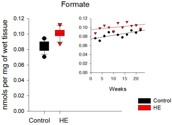 In the blood plasma and brain tissues of rats with chronic HE, the pattern of the distribution of Form was opposite to that of Pyr, Lac, and OA. Meanwhile, in the liver and kidneys of rats, the trends of its distribution coincided with the distribution of Pyr and OA, but not Lac. In general, in the blood plasma of rats with chronic HE, a decrease in the levels of Pyr, Lac, OA, αKGM, and Fum was noted, along with a slight increase in the level of Form and a noticeable increase in the levels of Cit and αKG.