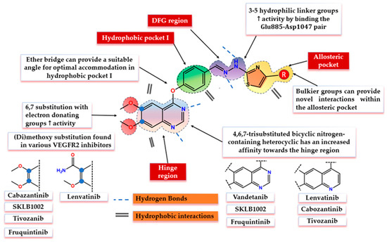 Chemical structures of the clinically approved VEGFR2 inhibitors and the distinctive structural features of the compounds in correlation with occupied regions of the catalytic cleft.