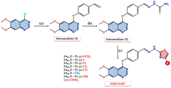 Seven novel quinazoline–thiazole (SA01–SA07) hybrid derivatives were synthesized according to the synthetic route depicted in Figure 3. The aldehyde intermediate (1) was synthesized in a good yield through the oxygen-alkylation of 4-hydroxy-benzaldehyde with 6,7-dimethoxy-4-chloro-quinazoline using a modified protocol previously reported [67]. Acetonitrile (MeCN) was used as a solvent, and the alkaline pH was provided by an excess (1:3 ratio) of potassium carbonate (K2CO3). The thiosemicarbazone intermediate (2) was synthesized according to a modified protocol reported by Marc et al. [35]. A ratio of 2:1 thiosemicarbazide to aldehyde derivative (1) was necessary to synthesize intermediate (2) in a satisfying yield with corresponding purity, due to limited progress of the reaction with a 1:1 ratio after 48 h with H2SO4 conc. used as a catalyst. The excess use of thiosemicarbazide was a favorable compromise due to its increased water solubility which made it easy to remove in the final phase of the isolation through repeated water rinsing.