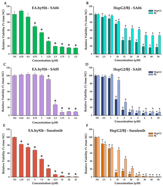 Cytotoxic effect of SA04 (A,B), SA05 (C,D), and sorafenib (E,F) after a 48 h exposure of EA.hy926, HepG2, and BJ cells. The results are expressed as relative means ± standard deviations of three biological replicates. Data are expressed as relative values compared to the negative control (NC) (100%). Asterisks (*) indicate significant differences (p < 0.05) compared to NC.