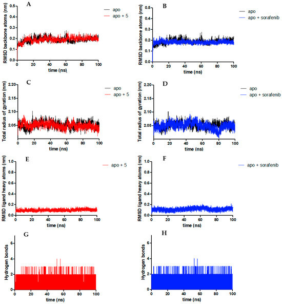Graphical representation of the MD parameters during the 100 nm simulations: RMSD trajectories of the heavy atoms of VEGFR2 for SA05 (A) and sorafenib (B); radius of gyration trajectories for SA05 (C) and sorafenib (D); RMSDs of the ligands’ heavy atoms for SA05 (E) and sorafenib (F); number of H-bonds encountered for SA05 (G) and sorafenib (H).