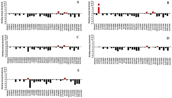 The average free binding energy calculation of the ligands SA02–SA05 and sorafenib to the VEGFR2 was computed based on the Molecular Mechanics–Poisson–Boltzmann Surface Area (MM-PBSA) using gmx_MMPBSA [59]. The last 25 ns of each MD simulation (all the last 2500 frames with no intervals) were analyzed to assess the energy involvement of each amino acid found within 5 Å using the energy decomposition strategy [60]. The energy variation between the ligand to protein and ligand unbound to the protein was computed using the formula ΔGbinding = Gcomplex – (Gcomplex + Gligand) [49,61].