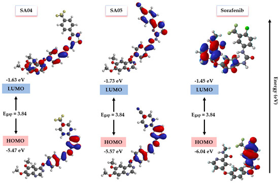 The DFT in silico calculations were performed with the B3LYP functional and the 6-311+G* basis set using Spartan 20 (Wavefunction, Inc., Irvine, CA, USA) to identify the electronic and structural characteristics of the compounds SA01–SA07 and sorafenib used as reference drug [61]. The calculations were performed to identify the regions of the molecules important for their interaction with VEGFR2 according to their electron density, angles, frontier molecular orbitals (FMOs), and dipole momentum. The global reactivity descriptors (GRDs) (I, A, μ, S, η, ω, N, ∆N) were also calculated [62].