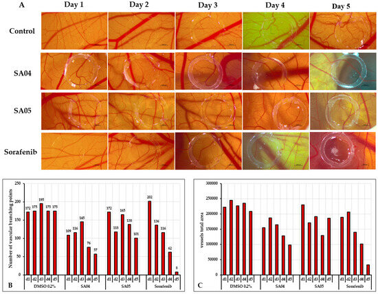 The assessment of anti-angiogenic impact began on the sixth day of embryonic development and extended over five days. To achieve this, a silicon ring was applied to the CAM, and 10 μL of the tested compounds was administered daily within the ring. The evaluation of angiogenesis involved daily photographic documentation of the vascular plexus using a Discovery v.8 stereomicroscope, a Zeiss Axio CAM 105 color camera, and ZEN core 3.8 software. For the quantitative assessment of the anti-angiogenic potential of SA04, SA05, and sorafenib compared to the control sample, a total area of 8*106 square pixels (Px2) around the area isolated by the silicon ring was selected. The quantitative evaluation of vessel numbers branching points and total vessel area was performed using the IKOSA Prism Application CAM assay (v3.1.0) [65].
