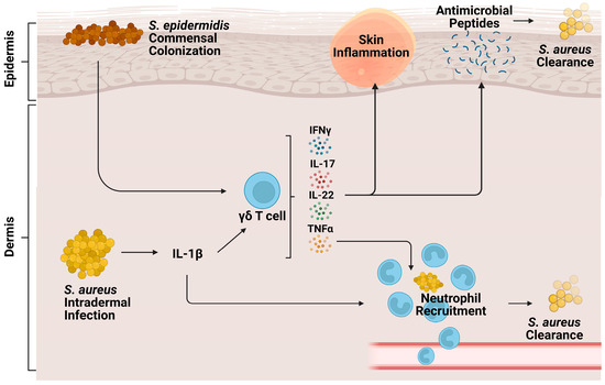 Cutaneous γδ T cells are important in early immune defense against S. aureus skin infection [56] (Figure 2). In a murine in vivo study of S. aureus skin infection, epidermal Vγ5+ γδ T cells induced by IL-1R and IL-23 signaling were protective against worsened infection; γδ T cell deficient mice had more significant lesion sizes, increased bacterial burdens, and lessened neutrophil recruitment and activity compared to both αβ T cell deficient mice and wild type (WT) mice [57]. This protective role is mediated by IL-17 production. γδ T cells comprise most of the IL-17-producing cells in S. aureus-infected skin [57,58]. Treatment of γδ T cell-deficient mice with a single dose of IL-17 abrogated the detrimental effects of γδ T cell deficiency [57]. IL-17+ γδ T and Th17 cells also play a compensatory role, promoting neutrophil recruitment in IL-1β deficient mice [59].