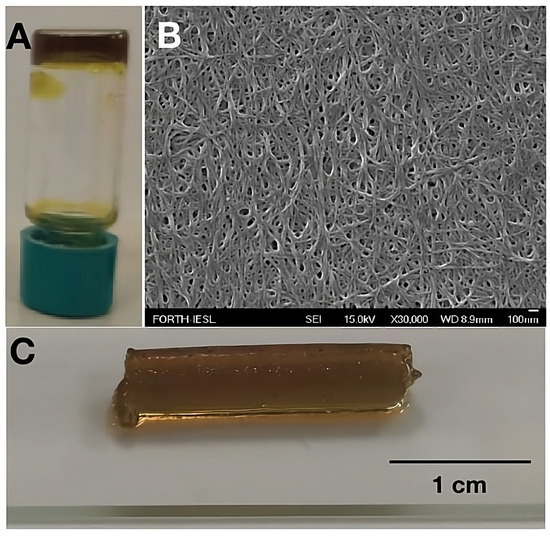 Fmoc-FF hydrogel. (A) The hydrogel in a glass vial placed upside down; (B) fibrillar formation as observed by FESEM (scale bar: 100 nm); (C) Fmoc-FF hydrogel shape integrity after being extruded from a syringe.