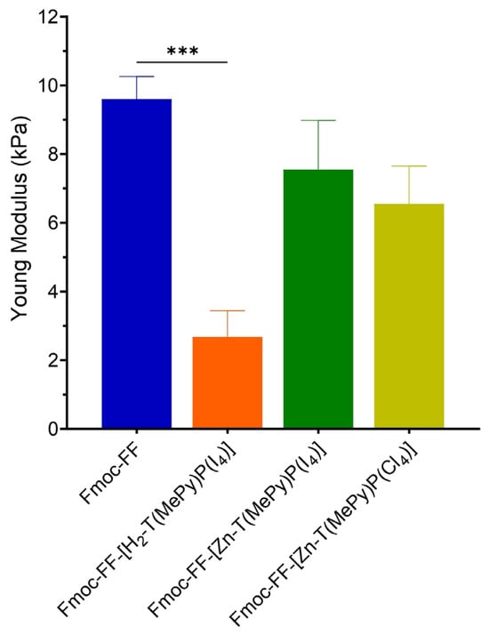 Young’s modulus provides insights into the material’s ability to resist deformation under stress. Young’s modulus measurements were obtained through uniaxial compression tests (Figure 5) [45,46]. The hydrogels made from Fmoc-FF (control) exhibited a Young’s modulus value of 9.6 ± 0.7 kPa, indicating mechanically stable structures in accordance with the values reported in the literature [42]. The Fmoc-FF-[Zn-T(MePy)P(I4)] hydrogels displayed a similar Young’s modulus value of 9.5 ± 1.4 kPa. The Fmoc-FF-[H2-T(MePy)P(I4)] hydrogel demonstrated a significantly lower Young’s modulus value of 2.3 ± 0.8 kPa compared to the control. These findings suggest that the complexation of Zn inside the porphyrin ring had a substantial impact on the stiffness of the hydrogel, resulting in a stronger material compared to the non-metalated derivative, with a Young’s modulus mirroring the one of the Fmoc-FF. The Fmoc-FF-[Zn-T(MePy)P(Cl4)] hydrogel showed a Young’s modulus value of 6.6 ± 1.1 kPa, which was not significantly different from the control.