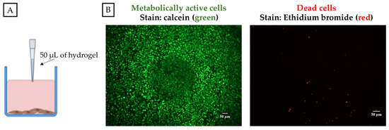 (A): Experimental setup for the Live/Dead cytotoxicity assay. The peptide hydrogel was directly added to pre-incubated NIH3T3 cells; (B) cell-hydrogel samples were stained and observed under a fluorescence microscope. Left: Exc 494/Em517 nm (green) for the calcein-green filter which detects live cells and right: the 528/617 nm filter for ethidium homodimer-1 for the dead cells.