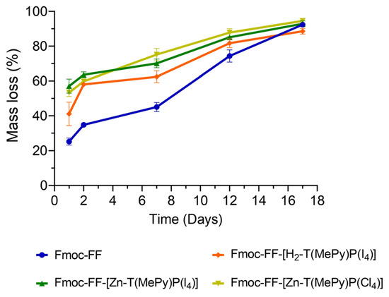 In order to assess the degradation rate of the peptide hydrogels in vitro, their mass loss was investigated after immersion in PBS at 1, 2, 7, 12, and 17 days (Figure 8). The Fmoc-FF hydrogel showed the lowest degradation percentage with a mass loss of 25 ± 2%, followed by 40 ± 7% of the Fmoc-FF-[H2-T(MePy)P(I4)] hydrogel within 24 h. At day 2, their mass loss increased by an additional 15 ± 1% and 20 ± 1%, respectively. However, the Fmoc-FF-[Zn-T(MePy)P(I4)] and Fmoc-FF-[Zn-T(MePy)P(Cl4)] hydrogels exhibited a higher degradation percentage on the first day, reaching approximately 55 ± 2% and 60 ± 4%, respectively, and finally reached 93 ± 2% on day 17. The Fmoc-FF-[H2-T(MePy)P(I4)] hydrogel reached a degradation percentage of 90 ± 2%, while the Fmoc-FF hydrogel reached a maximum mass loss of 90 ± 3% on day 17.