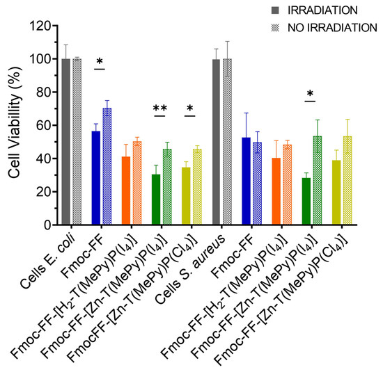 Plot of the cell viability of E. coli and S. aureus incubated with the Fmoc-FF hydrogel and the Fmoc-FF with encapsulated porphyrins H2-T(MePy)P(I4), Zn-T(MePy)P(I4), and Zn-T(MePy)P(Cl4), with and without light irradiation. * p ≤ 0.05, ** p ≤ 0.01. Two-way ANOVA. The experiments were carried out 3 times in triplicate (n = 9).