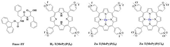 Formulations of the abovementioned antimicrobial agents, e.g., ointments, creams, etc., are important especially when destined for topical use, for example, in wound healing. Hydrogels have been proposed as an alternative wound-healing formulation in recent years. Hydrogels are polymeric networks that can maintain their structure and absorb a large amount of water [17]. The main advantage of hydrogels is that they provide a moist and beneficial environment at the wound site, which promotes tissue regeneration by granulation and re-epithelialization [18]. Hydrogels composed of chitosan, hyaluronic acid, and other carbohydrate-based hydrogels have been extensively studied as materials targeted for wound-healing applications [19]. Self-assembling peptides are another class of biomolecules that find biomedical applications due to their ability to self-organize into supramolecular structures, in the form of, for example, fibers, nanotubes, or hydrogels. These supramolecular structures are biocompatible and form under mild conditions, thanks to weak but significant secondary and non-covalent interactions [20]. The study of these structures finds great appeal in the fields of materials science, nanotechnology, and bio-medicine [21,22,23,24,25,26,27,28]. As they are ultrashort, i.e., less than six amino acid peptides, they form minimalistic building blocks that self-assemble into a variety of nanostructures, including hydrogels [29,30,31]. These ultrashort self-assembling peptide hydrogels are biocompatible and biodegradable and have recently gained interest for applications for tissue regeneration and wound healing [32,33,34]. The Phe-Phe (FF) dipeptide, when protected at the N-terminus with the Fmoc (fluorenyl-methoxycarbonyl) group, represents a minimal building block that can self-assemble and form hydrogels at the physiological pH [35]. Numerous studies have demonstrated the capability of the Fmoc-FF dipeptide, shown in Scheme 1, to self-assemble into hydrogels that can act as tissue engineering scaffolds or as reservoirs for the encapsulation and controlled release of model small molecules or drugs [36,37]. Therefore, Fmoc-FF hydrogels, in combination with their anti-infective properties, were deemed suitable scaffolds for biomedical applications such as controlled drug delivery [38]. We have recently encapsulated the water-soluble porphyrin H2-T(MePy)P(I4), shown in Scheme 1, into Fmoc-FF hydrogels; the delivery of the porphyrin through the self-assembling hydrogel accelerated the healing of experimental wound defects in vivo [39].
