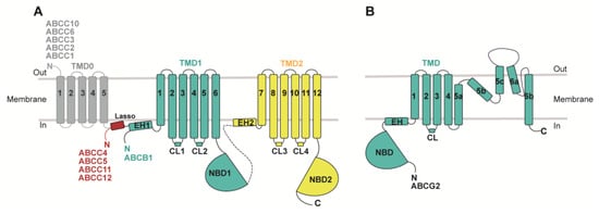 Topology diagrams of MDR-related ABC transporters. (A) ABCB1 and MRPs (ABCC1–6, ABCC10–12). (B) ABCG2. Regions not included in the models are represented by dashed lines. Lasso indicates the lasso motif; EH indicates the elbow helices.