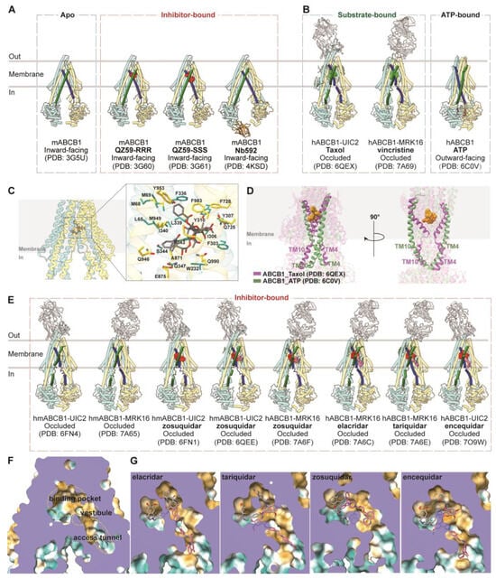 Structural studies have enhanced our understanding of the inhibition mechanisms of ABCB1. The crystal structures of apo and cyclic peptide-inhibited ABCB1 reveal the inward-facing confirmation, signifying an initial stage in the transport cycle that is conducive to drug binding. Substrates or inhibitors may exist during their initial entry into the internal cavity, potentially elucidating their role in regulating ATPase activity. Determinations of UIC2-bound or MRK16-bound ABCB1 with inhibitor zosuquidar (PDB codes: 6FN1, 6QEE, and 7A6F), elacridar (PDB code: 7A6C), tariquidar (PDB code: 7A6E), and encequidar (PDB code: 7O9W) have provided insights into their occluded conformations (Figure 2E) [,,,]. These structures reveal a pair of inhibitor molecules occupying the central cavity, where substrate drug molecules occupy. Several residues comprising the central cavity, including Tyr310, Phe343, Gln725, Gln949, Tyr953, and Phe983, both participate in substrate drug molecules and inhibitor molecules binding (Table 1). Notably, one of the two inhibitor molecules extends into the “vestibule” and/or “access tunnel” facing the cytoplasmic gate []. In most cases, one U-shaped molecule binds to the central pocket, while one L-shaped molecule extends into the vestibule/access tunnel (Figure 2F,G). TM9 plays a role in distinguishing substrates and inhibitors by moving into the vestibule and access tunnel after substrate binding, acting as an “initiator” for extrusion release. Additionally, the molecule in the access tunnel may function as a noncompetitive inhibitor [].