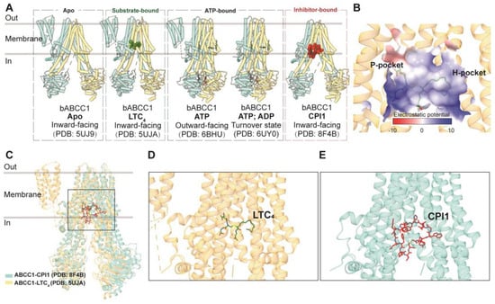 Structurally, ABCC1 consists of a single polypeptide containing three TMDs, comprising two canonical TMDs and an N-terminal TMD0, collectively housing 17 transmembrane helices. To date, only structures of bovine ABCC1, which shares 91% sequence identity with human ABCC1, have been determined, serving as valuable templates for studying the human homolog. The apo form of ABCC1 (PDB code: 5UJ9) has been resolved in an inward-facing conformation []. Additionally, the structure of ABCC1 bound to its physiological substrate, leukotriene C4 (LTC4) (PDB code: 5UJA), was also determined to be in an inward-facing conformation but with a closer distance between the two nucleotide-binding domains (NBDs) (Figure 4A) []. This structure elucidates the direct recruitment of the substrate from the cytosol and reveals the bipartite binding site, which comprises partially positively charged (the P-pocket) and partially hydrophobic (the H-pocket) regions to accommodate hydrophobic moieties (Figure 4B). LTC4 binds within the central cavity formed by the two TMDs, establishing an intricate interaction network with both TMD bundles (Figure 4C,D). LTC4 binding at the center of the two TMDs brings the two NBDs approximately 12 Å closer, explaining the increased ATPase activity observed in the presence of LTC4 and the concomitant rearrangement of residues within the binding site to adapt to the substrate (Figure 4C).