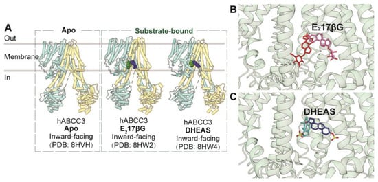 Structures of ABCC3 and central binding cavity. (A) Overview of human ABCC3 (hABCC3) structures in apo and substrate-bound states in cartoon representations. (B,C) Close-up views of a pair of E217βG ((B), red and pink sticks, PDB code: 8HW2) and DHEAS ((C), cyan and dark blue sticks, PDB code: 8HW4) molecules in the central binding pocket of ABCC3 in cartoon representation colored in green.