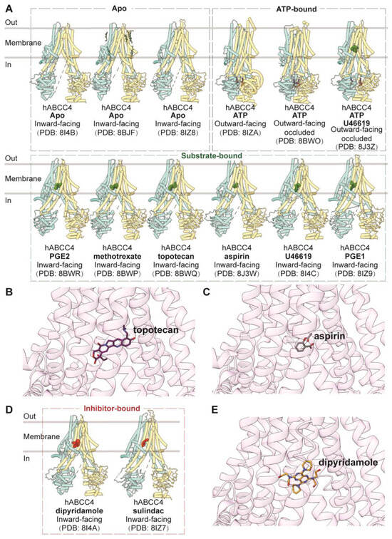 Structures of ABCC4 and central binding cavity. (A) Overview of human ABCC4 (hABCC4) structures in apo, nucleotide- and substrate-bound states in cartoon representations. (B,C) Close-up views of topotecan (purple sticks, PDB code: 8BWQ) and aspirin (grey sticks, PDB code: 8J3W) in the central binding pocket of ABCC4 in cartoon representation colored in pink. (D) Overview of hABCC4 structures in inhibitor-bound states in cartoon representations. (E) Close-up view of inhibitor dipyridamole (yellow sticks, PDB code: 8I4A) in the central binding pocket of ABCC4.