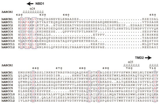 Multiple sequence alignment of human ABCB1 (hABCB1) and MRPs (hABCC1–ABCC6, hABCC10–ABCC12) of the central linker region. Representative secondary structural elements of hABCB1 are indicated above the sequences. Highly conserved residues are colored red.