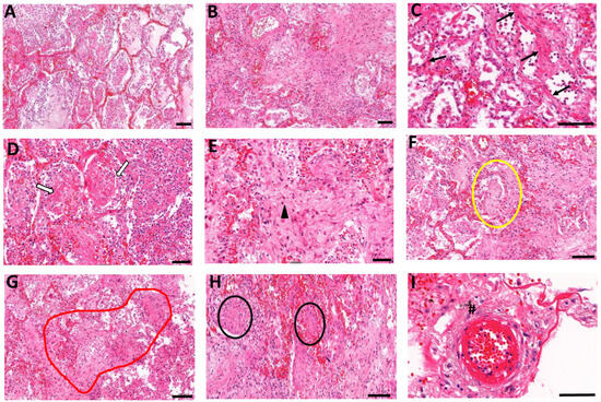 Lung histopathology analyses of COVID-19 patients. Autopsy lung samples collected from COVID-19 patients show major patterns of (A) widespread diffuse alveolar damage and (B) fibrosing organizing pneumonia. Fibrotic changes in COVID-19 patients show variable patterns including (C) interstitial fibrotic development (black arrows), (D) intra-alveolar fibrin deposition and organizing fibrosis, showing spreading of fibrosis in alveoli (white arrows), and (E) diffuse alveolar fibrosis within small airways (arrowhead). (F) Loose myxoid fibroblastic proliferation extended between the alveoli-forming Mason bodies in alveolar and bronchiolar regions (yellowoval). (G) Bronchiolitis obliterans organizing pneumonia (BOOP)-like areas (redoutline). (H) Squamous cells forming distinct nodules (blackovals). (I) Disrupted small blood vessels also displayed perivascular fibroblast proliferations (hash mark). Scale bars = 100 μm.