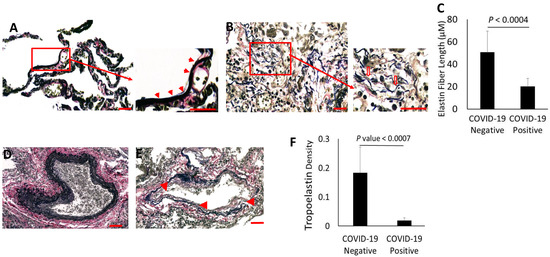 Quantitative measurements confirmed that the lengths of elastin fibers were significantly reduced in lungs of COVID-19 patients (Figure 2C). In parallel, elastin fibers in the perivascular regions also displayed extensive dispersal in COVID-19 patients (Figure 2D,E). The loss of elastin along the blood vessels was associated with severe endothelial necrosis and distortion of the blood vessel structures. Thus, the loss of lungcapacity was compounded by the lack of elasticity in blood vessels necessary for gas exchange. In support of these findings, the Western blot analysis of elastin from protein extracts of formalin-fixed paraffin-embedded (FFPE) COVID-19 lungs identified a dramatic reduction in the tropoelastin band at 70 kDa, whereas lung extracts from COVID-19-negative patients contained clearly detectable tropoelastin (Figure 2F). The densitometry analysis (Figure 2F) revealed a significant reduction in tropoelastin concentrations in COVID-19 lungs, supporting the morphometric analysis of elastin degradation in the COVID-19 lungs.