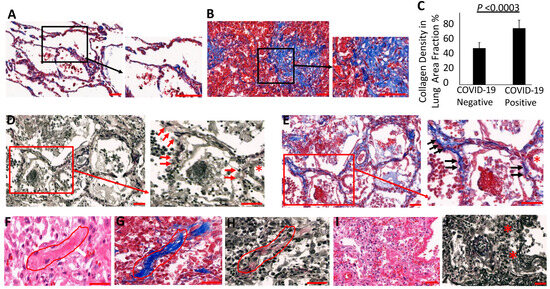 Loss of elastin is accompanied by collagenous fibrosis in the alveolar interstitium and perivascular regions. Collagen was measured in (A) COVID-19 negative and (B) COVID-19 positive lungs using Masson’s trichrome collagen-specific staining. (C) The density of collagen in the lung was quantified using ImageJ analysis as described in the methods and at least 10 randomly selected fields from each lung section were measured. Collagen density measurements were represented as means ± SD in lung sections from COVID-19 patients (n = 8) and non-COVID-19 patients (n = 6). (D) Necrotic and denuded alveolar epithelial lining displayed elastolysis (red arrows—loss of elastin in the alveolar walls; red asterisk—epithelial denudation; black arrows—collagen accumulation) and (E) dense collagen deposition. (F–H) Collagen replacing elastin fibers in the formation of interstitial fibrotic changes in COVID-19 patients evident by H&E, collagen deposition, and elastin degradation, respectively (redoutline). (I,J) Lung parenchyma shows alveolar collapse (red asterisks) fibrotic development and reduction in elastin fibers. Scale bar = 100 μm.
