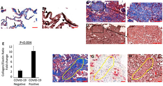 Measurement of collagen/elastin ratio. The density of collagen and elastin fibers’ distribution in the lung parenchyma was measured in COVID-19-positive and COVID-19-negative patients. Adjacent lung sections stained with Masson’s trichrome and orcein from a non-COVID-19 patient ((A), collagen—black arrows and (B), elastin—black arrowheads). COVID-19 patient lungs displayed (C) widespread collagen deposition and (D) a complete loss of elastin. (E) The collagen/elastin ratio was quantified using ImageJ analysis as described in the methods. (F–H) Areas of fibrosing organizing pneumonia also displayed extensive loss of alveolar epithelium stained with TTF-1 ((G); yellow outline), while undamaged areas showed positive staining for TTF-1 ((G); red arrow) and elastin ((H); red arrow). The values of collagen/elastin densities were represented as means ± SD in lung sections from COVID-19 patients (n = 8) and non-COVID-19 patients (n = 6). Scale bar = 100 μm.