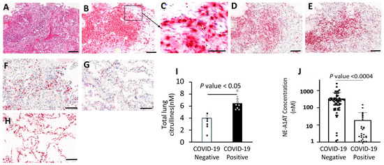 Although neutrophil influx and NET release were reported in COVID-19 patient lungs, their pathogenic role is not well understood. In COVID19 lungs analyzed here, massive neutrophil aggregates were observedwithin the airways and alveolar spaces that displayed widespread disintegration of alveolar architecture (Figure 5A–D), The lung neutrophils displayed strong immunostaining for granule proteins including NE, myeloperoxidase, and PAD4, which co-localized within the regions of neutrophil aggregates in the alveoli (Figure 5E). Control lungs showed reduced immunoreactivity for NE, MPO, and PAD4 (Figure 5F–H). Quantitative measurements identified an increase in total citrullines in COVID-19 lungs compared to controls (Figure 5I). Strong NE, MPO, and PAD4 staining in the extracellular space within the disintegrated alveoli is consistent with the degranulation of neutrophils in the inflammatory microenvironment.