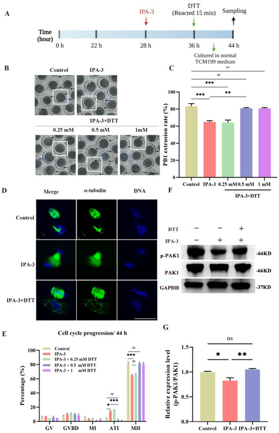 (A) The schematic diagram for the experimental design of DTT rescue. (B) Representative images of the PB1 extrusion with 20 μM IPA-3 and different doses of DTT treatment. Arrow, the PB1. Scale bar = 100 μm. (C) The PB1 extrusion rate in different groups. n = 120. (D) Representative images of the cytoskeleton with 20 μM IPA-3 and different doses of DTT treatment. Green, α-tubulin; blue, chromosome. Scale bar = 20 μm. (E) The analysis of cell cycle progression in different groups. n = 120. (F) Representative images of p-PAK1 expression after 44 h of culture using immunoblotting. (G) The analysis of p-PAK1/PAK1 expression in oocytes. DTT, dithiothreitol. The letter “n” means the total number of oocytes in each group. ns, p > 0.05; *, p < 0.05; **, p < 0.01; ***, p < 0.001. Original blot images can be found in Supplementary File S1.