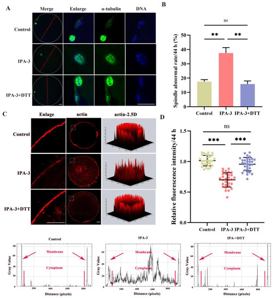 Based on these results, 0.5 mM DTT was used for subsequent studies to repair the inhibition of IPA-3 on PAK1 activity. The expression of p-PAK1 in the IPA-3 + DTT group was increased (p < 0.01, Figure 4F,G) compared with that in the IPA-3 treatment group after a total of 44 h. In the IPA-3 + DTT group, the percentage of abnormal spindles had also markedly decreased compared to the IPA-3 treatment group (37.50 ± 3.8% vs. 15.83 ± 2.2%, p < 0.01, Figure 5A,B), and the spindle in the IPA-3 + DTT group exhibited a peripheral localization. Moreover, the distribution of actin filaments was restored after 0.5 mM DTT treatment, in which the actin cap was formed and action filaments were normally distributed at the membrane of the oocytes, and the relative fluorescence intensity of membrane actin in the DTT group was higher than that of the IPA-3 group (Figure 5C,D, p < 0.001).