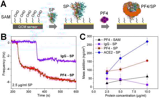 We first utilized quartz crystal microbalance (QCM), which is a label-free and highly sensitive technique, to detect the binding of SP with PF4 based on additional mass or frequency changes on a real-time basis. The SP was first immobilized on a QCM chip via glutaraldehyde linkers, and pumping PF4 on the chip allowed for their bindings (Figure 1A). As controls, human IgG isolated from healthy donors which are known to not interact with SPs was used as a negative control whereas the ACE2 that interacts strongly with SP served as a positive control. Typical QCM spectra showed a strong frequency shift when adding IgG control or PF4 to the SP-coated sensors (Figure 1B). The titration of proteins up to 10 µg/mL including PF4 to SAM layer or PF4, IgG, and ACE2 to SP-coated sensors allowed us to determine the variations in mass changes (Figure 1C). The strongest mass increase was observed for ACE2 (Figure 1C, blue), followed by PF4 (Figure 1C, red), and the lowest for human IgG (Figure 1C, violet) when they were added to the SP-coated sensors. Pumping PF4 to sensors coated with SAM shows only background mass changes (Figure 1C, black), which is comparable with that of IgG to the SP-coated chip (Figure 1C, violet). The higher mass increase of ACE2 than PF4 when binding to the same SP-coated sensors was due to its higher molecular weight (85 kDa for ACE2 vs. 32 kDa for PF4 tetramer). The results together indicate the binding of PF4 to SP.