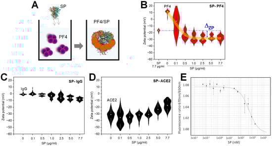 To further understand the binding of SP to PF4, we examined the interaction in the liquid phase using dynamic light scattering (DLS) instead of immobilization on the solid phase. For that, SP (up to 7.7 µg/mL) was titrated in a cuvette containing PF4 (20 µg/mL), and the change in surface zeta potential was determined (Figure 2A). The SP or PF4 alone has a zeta potential around −16 mV or +12 mV, respectively. As only a surface potential around zero facilitates protein aggregation, this negative or positive zeta potential indicates their low tendency of accumulation among SP or PF4 (=high stability). When titrating SP concentrations into PF4, the zeta potential of PF4 was switched from positive to negative values. At low SP concentrations (≤1 µg/mL), zeta potential largely varied, indicating an unstable protein mixture. However, the system became stable as zeta potential saturated at higher SP concentration (from ≥2.5 µg/mL). Compared with SP alone, PF4/SP complexes exhibited higher in negative zeta potential (ΔZP ≈ −10 mV) (Figure 2B, arrow). The results indicate that SP bound to PF4 and altered structures of the original proteins, resulting in the exposure of residues with negatively charged surfaces. With controls, the SP did not cause a significant change in zeta potential when interacting with human IgG (Figure 2C), whereas it caused a strong increase in negative zeta potential when interacting with ACE2 (Figure 2D). However, the binding mechanisms of the SP to PF4 differs from that to ACE2. SP promoted PF4 to expose amino acids with negative zeta potential that reached saturation at approx. 1.0 µg/mL SP (about −25 mV) (Figure 2B). However, its binding caused an expression of amino acids with positive zeta potential, indicated by a reduction in negative zeta potential as SP concentration increases (Figure 2D). Interestingly, PF4–SP binding reached a saturation from 1.0 µg/mL but no such saturation was seen in the ACE2–SP system up to 7.7 µg/mL SP concentration (Figure 2D), indicating a higher binding affinity of SP to PF4 than ACE2.