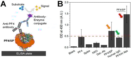3.3. The Confirmation of PF4–SP Binding in the Enzyme-Linked Immunosorbent Assay (ELISA)