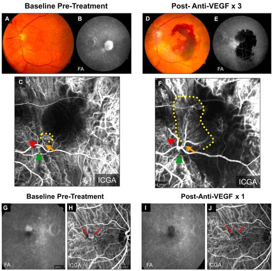 Clinical examples of treatment responses in arteriolar CNV and capillary CNV. (A–F) Arteriolar CNV. At baseline, (A) fundus photography and (B) fluorescein angiography (FA) demonstrate evidence of serous pigment epithelial detachment, (C) indocyanine green angiography (ICGA) demonstrates an arteriolar predominant lesion, with feeder artery (red arrowhead), arteriole (orange arrow), ill-defined marginal rim of vessels (yellow-dotted region, probable capillaries), and draining vein (green arrowhead). Post-loading dose with three anti-VEGF treatments, (D) there is large submacular hemorrhage in the macula by clinical exam and fundus photography, (E) FA demonstrates blockage of fluorescence from the hemorrhage but increased late hyperfluorescence at the margin with expanding, blurry margins consistent with leakage from CNV, and (F) ICGA demonstrates growth of the CNV lesion, with increased vessel caliber of choroidal feeder artery (red arrowhead), growth of new branching arterioles (orange arrow), extension of arterioles with vascular loops without visible capillaries into the macula (yellow-dotted region), and draining venule (green arrowhead). (G–J) Capillary CNV. At baseline, (G) FA demonstrates a Type 2 CNV pattern and (H) ICGA demonstrates capillary CNV morphology (red arrows). Post-treatment with a single anti-VEGF, (I) FA shows clearance of the CNV and (J) ICGA shows regression of the capillary microvascular structure (red arrows). Used with permission of Elsevier Science and Technology Journals, from Ref. [9]; permission conveyed through Copyright Clearance Center, Inc.