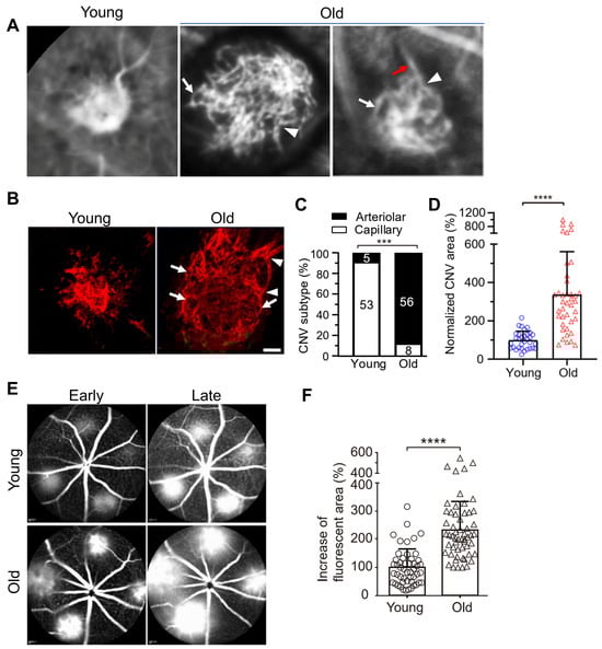 Vascular morphology of laser-induced CNV in young and old mice. (A) ICGA of laser-induced CNV in young and old mice. White arrows and arrowheads indicate vascular loops and branching arterioles in old mice, respectively. Red arrows indicate a large caliber feeder vessel. (B) Representative images of CNV lesions labeled by Alexa 568 isolectin on RPE/choroid flatmounts in young and old mice. White arrowheads and arrows indicate branching arterioles and vascular loops in old mice, respectively. Scale bar = 40 μm. (C) Distribution of capillary and arteriolar CNV in young versus old mice based on ICGA. The numbers inside the bars indicate the number of CNV laser spots. ***, p < 0.001. (D) Quantitative results of normalized CNV area in young and old mice. CNV areas were measured from Alexa 568 isolectin labeled RPE/choroid flatmounts. N = 32 and 40 laser spots in young and old mice, respectively. Bars represent mean ± SD. ****, p < 0.0001. (E) Early and late phase FA show that laser-induced CNV in old mice exhibits significantly increased hyperpermeability compared with that in young mice. (F) The percentage increase of fluorescent area of CNV between the early and late phases of FA. Bars represent mean ± SD. ****, p < 0.0001. Adapted from Ref. [40].