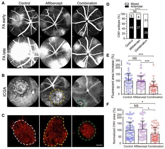 Comparison between aflibercept and combination therapy (AIBP, apoA-I, and aflibercept) in suppressing laser-induced CNV in old mice. Representative (A) FA, (B) ICGA, and (C) Alexa 568 isolectin labeled RPE/choroid flatmounts of CNV lesions after treatments. (D) CNV vessel type quantification based on isolectin-B4 staining. The numbers inside the bars indicate the number of CNV laser spots. (E) Quantitative results of the percentage increase of fluorescent area in CNV lesions between the early and late phases of FA. (F) Quantitative results of normalized CNV area. Old mice were treated on day 2 (A–E) and were analyzed at day 7 post laser injury. White and yellow dashed circles indicate arteriolar CNV in control and aflibercept treated mice. Green dashed circles indicate mixed type CNV in combination therapy treated mice in B and C. Mice treated on day 4 showed similar results. Bars represent mean ± SD. NS, p > 0.05; *, p < 0.05; ***, p < 0.001; ****, p < 0.0001. Adapted from Ref. [40].