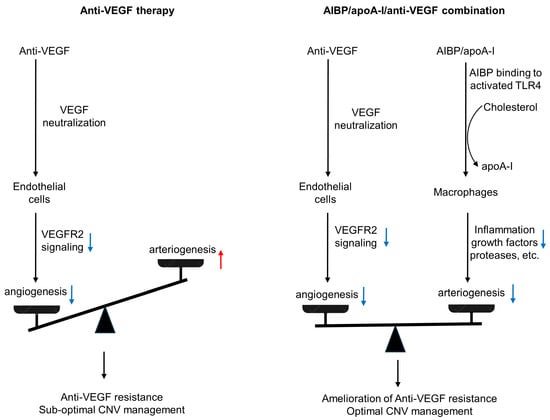 Cholesterol-rich lipid rafts harboring activated receptors (e.g., VEGFR2, TLR4) serve as the organizing platform to initiate angiogenic and inflammatory signaling [108,110,111,112]. Extracellular apolipoprotein A-I (apoA-I) binding protein (AIBP) regulates lipid rafts via augmenting cholesterol efflux from endothelial cells, macrophages, and T cells, resulting in inhibition of angiogenesis and atherosclerosis, etc. [39,113,114,115,116,117,118,119,120]. AIBP binds its partner apoA-I or high-density lipoprotein (HDL), to enhance cholesterol efflux and inhibit lipid raft-anchored VEGFR2 signaling in endothelial cells [39,113]. By binding to the Toll-like receptor 4 (TLR4), AIBP/apoA-I augments cholesterol efflux from macrophages and microglia, normalizes plasma lipid rafts, and suppresses inflammation [109,114,115,121]. The ability of AIBP to target both hyperactive endothelial cells and cholesterol-laden macrophages makes it an ideal candidate to address the challenge of anti-VEGF resistance in CNV treatment. We found that a combination of AIBP/apoA-I and anti-VEGF treatment ameliorated anti-VEGF resistance to aflibercept in experimental CNV in old mice by robustly inhibiting arteriolar CNV (Figure 3) [40]. Despite sharing endothelial VEGFR2 signaling as a common target, combined AIBP and anti-VEGF provide synergistic therapeutic benefits for CNV. This is because macrophages that are recruited by VEGF to lesion sites of inflammation secrete additional VEGF and other pro-angiogenic factors, thereby creating strong positive feedback loops [91,92,122]. Thus, both anti-VEGF agents and AIBP are required to interrupt the vicious cycle of events initiated by the reciprocal causal nexus of VEGF and inflammation.
